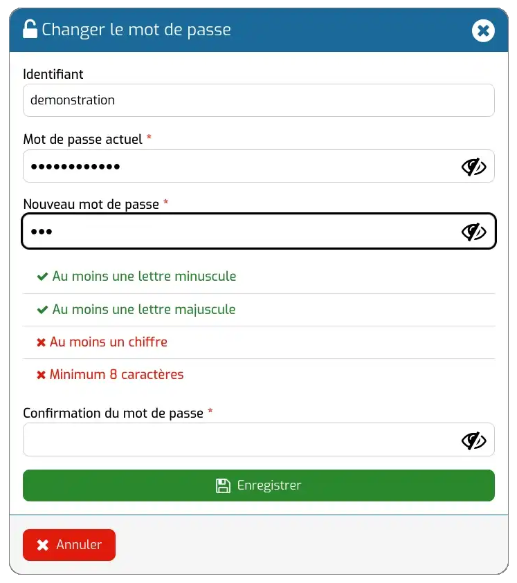 Pour changer son mot de passe, l’utilisateur doit saisir un nouveau mot de passe suffisamment robuste (d’une longueur minimale de 8 caractères avec au moins une lettre minuscule, 1 lettre majuscule et 1 chiffre). D’autre part, il lui est demandé de saisir le même mot de passe une deuxième fois pour confirmation.